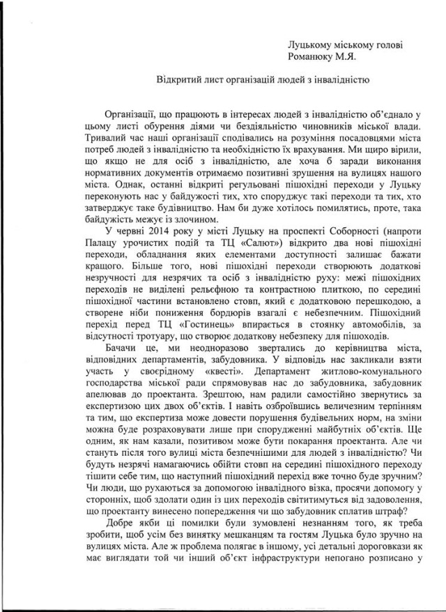У редакцію Інформаційного агентства Волинські Новини надійшов відкритий лист організацій людей з інвалідністю Луцькому міському голові Миколі Романюку.