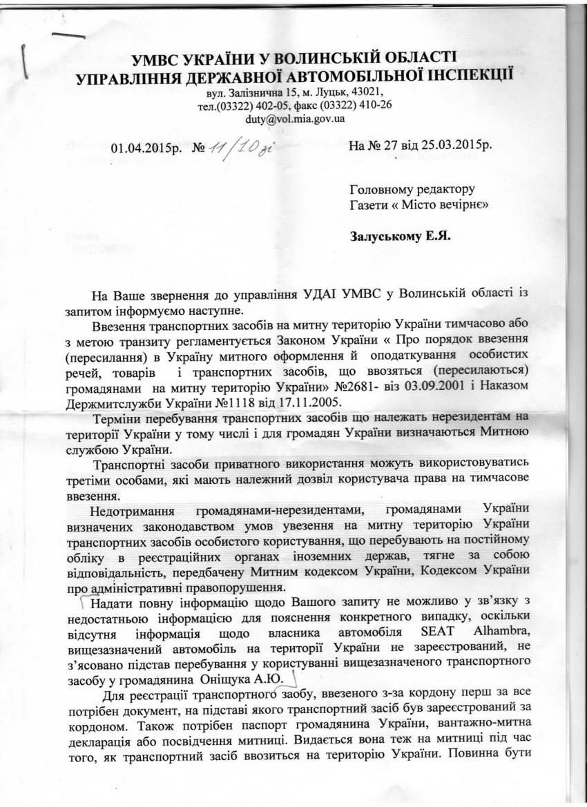 В управлінні ДАІ відповіли, що «надати повну інформацію не можливо у зв’язку з недостатньою інформацією для пояснення конкретного випадку, оскільки відсутня інформація щодо власника автомобіля «SEAT Alhambra», вищезазначений автомобіль на території України не зареєстрований, не з’ясовано підстав перебування у користуванні вищезазначеного транспортного засобу у громадянина Оніщука А. Ю».