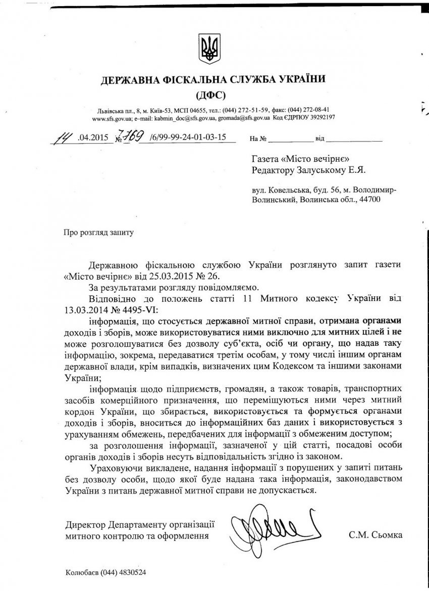 У відповідь на інформаційний запит щодо автомобіля «SEAT Alhambra» та його власників від фіскальної служби надійшла відписка, що «надання інформації без дозволу особи, щодо якої буде надано інформацію, законодавством України з питань державної митної справи не допускається».
