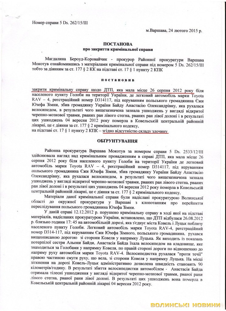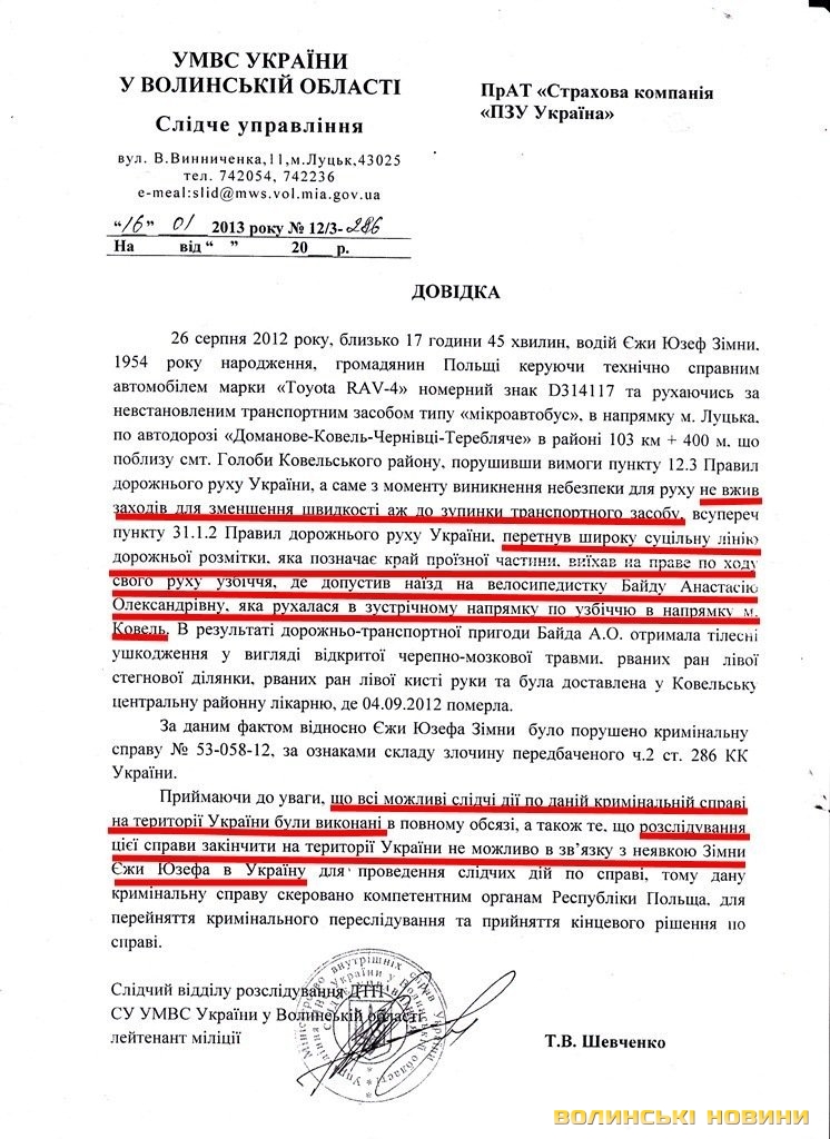 Власне, у надісланих документах йдеться про те, що кримінальну справу в Польщі порушили 12 грудня 2012 року на підставі надісланих українською стороною матеріалів. Згідно з матеріалами справи, Єжи Юзеф Зімни рухався трасою М19 з боку Ковеля в напрямку Луцька.В справі є свідчення, що Анастасія Байда їхала на кладовище, яке розташоване за Голобами в напрямку Ковеля. Себто, жінка рухалася «проти течії» правою частиною смуги руху.До слова, у довідці, наданій УМВС області страховикам, йдеться, що причиною ДТП є перевищення швидкості автомобіля, за кермом якого був громадянин Польщі.