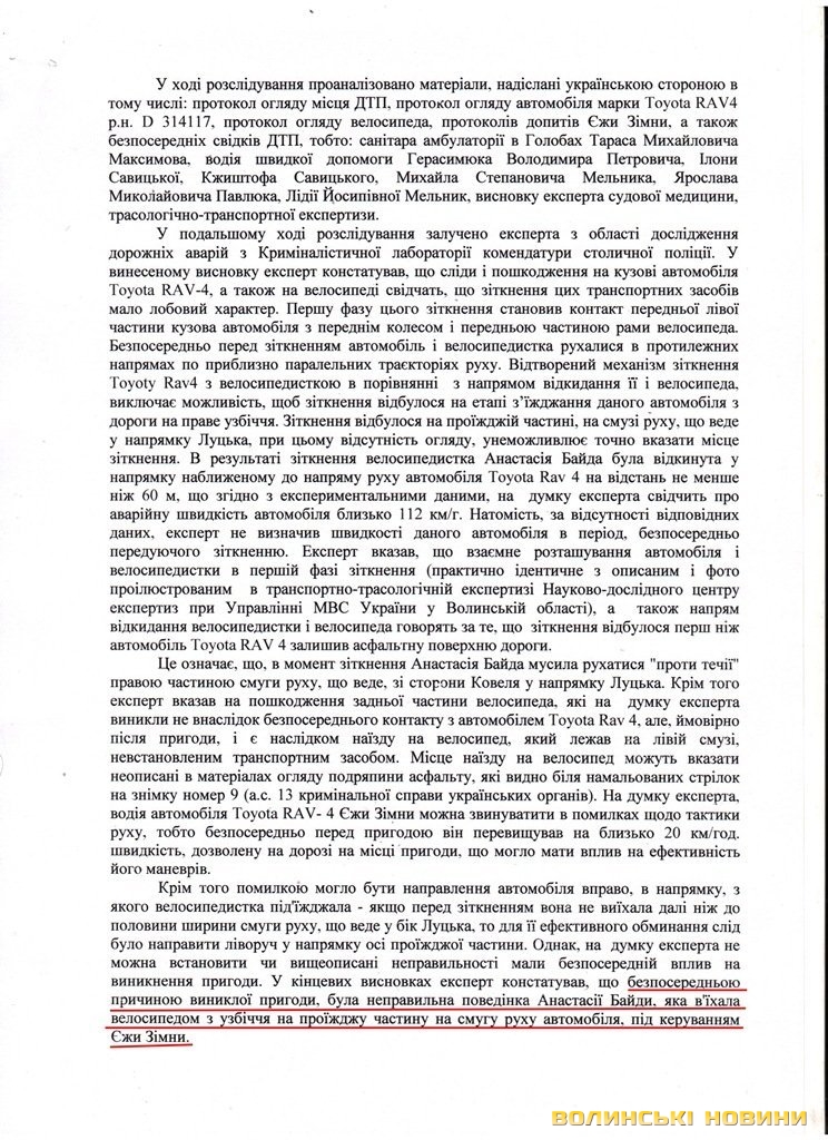«Водій Єжи Юзеф Зімни … порушив вимоги пункту 12.3 Правил дорожнього руху України, а саме з моменту виникнення небезпеки для руху не вжив заходів для зменшення швидкості аж до зупинки транспортного засобу, всупереч пункту 31.1.2 Правил… перетнув широку суцільну лінію дорожньої розмітки, яка позначає край проїжджої частини, виїхав на праве по ходу свого руху узбіччя, де допустив наїзд на велосипедистку, яка рухалася в напрямку Ковеля», - повідомляли українські криміналісти.