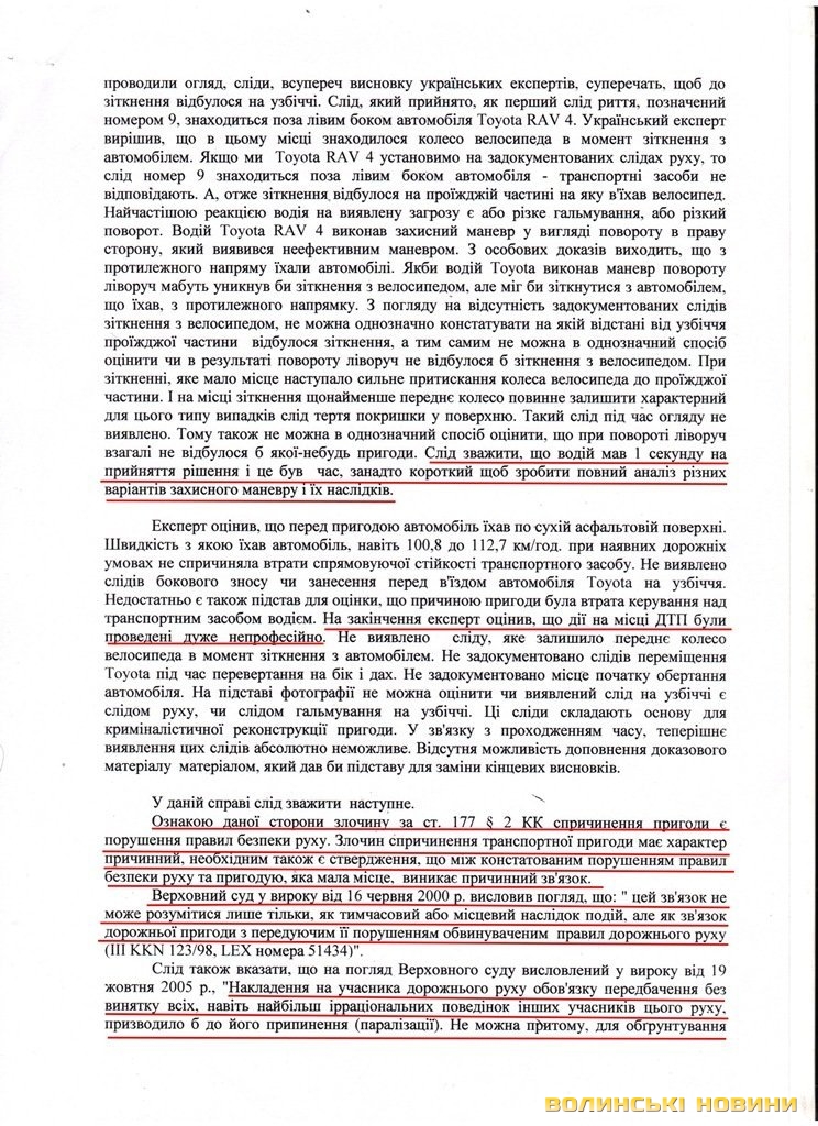 Проте в подальших висновках експерт стверджує, що безпосередньою причиною автопригоди стала неправильна поведінка велосипедистки, яка з’їхала з узбіччя на проїжджу частину.