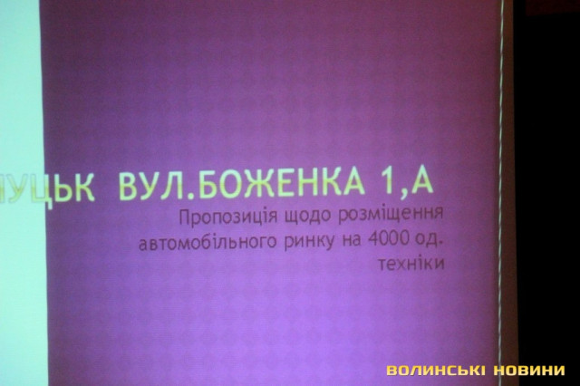 На розгляд учасників слухань троє підприємців запропонували свої варіанти майбутнього авторинку. Так, представник підприємства «Дельта-7» Юрій Дехтеренко пропонує майданчик на вулиці Боженка, 1А. Він розповів, що на цій території у 2007 році, коли постало питання про реконструкцію центрального ринку у Луцьку, «у чистому полі побудували ринок». Він, мовляв, побудований із дотриманням усіх протипожежних норм і правил. Назву «Новий ринок», мовляв, готові змінити на «Новий автомобільний ринок».