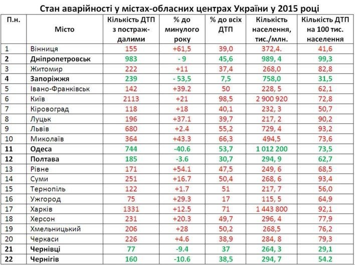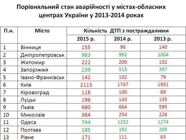 Аналіз статистики аварійності, яку на своєму сайті оприлюднює Управління безпеки дорожнього руху Національної поліції України, за останні три роки показує, що з 22-х українських міст стабільне зменшення кількості аварій з постраждалими простежується лише у 6 містах (Дніпропетровську, Запоріжжі, Одесі, Полтаві, Чернівцях та Чернігові). В решті ж міст статистика зафіксувала чітку тенденцію до збільшення цих показників.