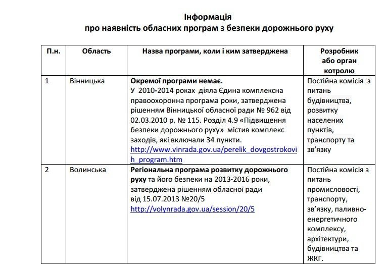 Як показують результати дослідження, лише у 6 містах (Вінниці, Житомирі, Миколаєві, Полтаві, Рівному та Харкові) були ухвалені і є чинними міські програми з підвищення безпеки дорожнього руху.