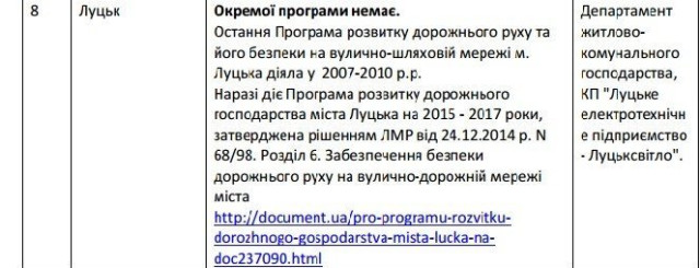 Луцьк – один із чотирьох обласних центрів України, де діють лише окремі заходи з підвищення безпеки дорожнього руху, що включені до міських програм. А Волинь входить у десятку областей, де за станом на 1 січня 2016 року є обласна програма з підвищення безпеки дорожнього руху, що затверджена облрадою.
