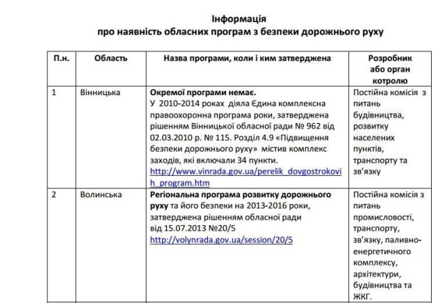 У 4 обласних центрах (Івано-Франківську, Луцьку, Одесі та Чернігові) були передбачені тільки окремі заходи з підвищення безпеки дорожнього руху, які включені до інших міських програм. А в решті обласних центрів (Дніпропетровську, Запоріжжі, Івано-Франківську, Києві, Кіровограді, Львові, Сумах, Хмельницький, Херсоні, Чернівцях та Ужгороді) програми з підвищення БДР не розроблялись і не увалювались, або термін їх дії закінчився.