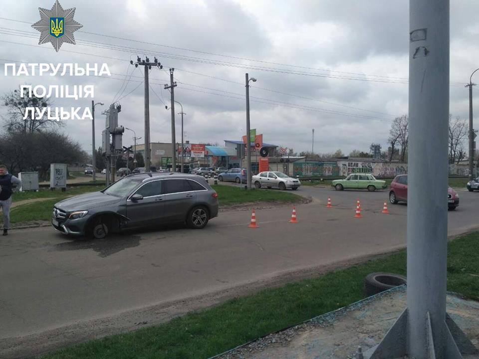 Трохи пізніше патрульні оформляли ДТП на вулиці Карпенка-Карого: тут водій на Mercedes в’їхав у яму, і переднє колесо відірвалось.