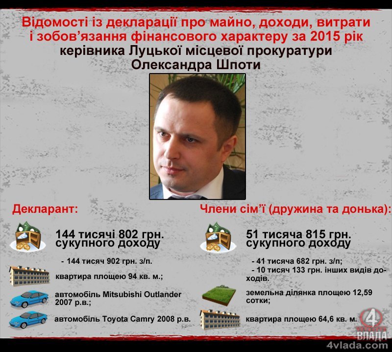 У своїй декларації за 2015 рік Олександр Шпота вказав 144 тисячі 802 гривні сукупного доходу. Члени його сім’ї, серед яких дружина та дочка, заробили значно менше – 51 тисячу 815 гривень.
