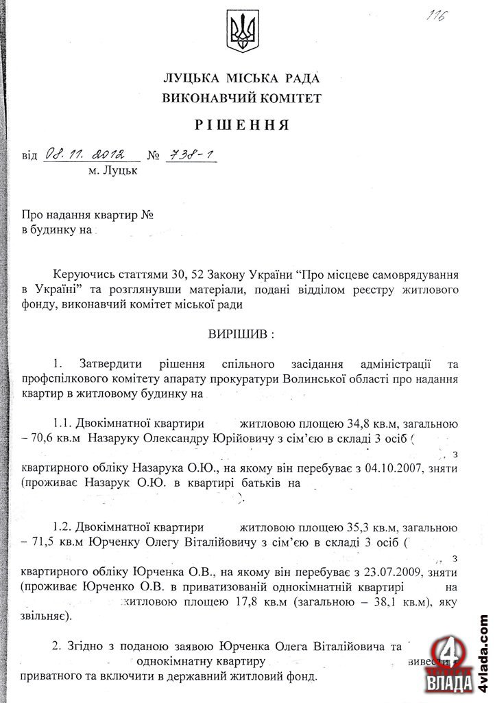 У листопаді 2012 року Олег Юрченко став власником двокімнатної квартири від держави площею 71,5 кв. м. в Луцьку в обмін на однокімнатне помешкання, в якому він проживав до цього.Заступником керівника Луцької місцевої прокуратури стала Катерина Балас.Згідно з біографією, у 2004-2005 роках вона працювала старшим помічником прокурора Ківерцівського району, згодом у 2005-2006 – помічником Волинського природоохоронного міжрайонного прокурора.