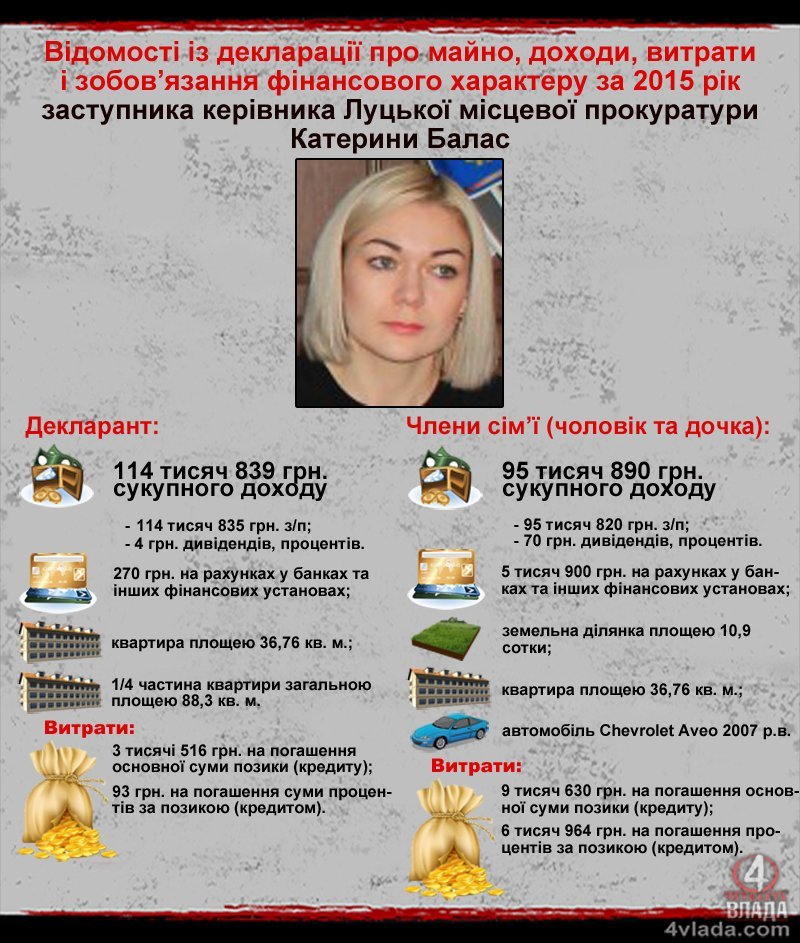 За 2015 рік Катерина Балас задекларувала майже 115 тисяч гривень доходу та 270 гривень на рахунку у банку. Її чоловік з дочкою отримав 95 тисяч 890 гривень доходу та задекларував 5 тисяч 900 гривень на рахунках у банках.