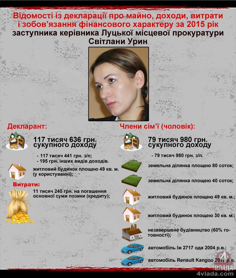 За 2015 рік Світлана Урин задекларувала 117 тисяч 636 гривень доходів. Ще майже 80 тисяч заробив торік її чоловік.