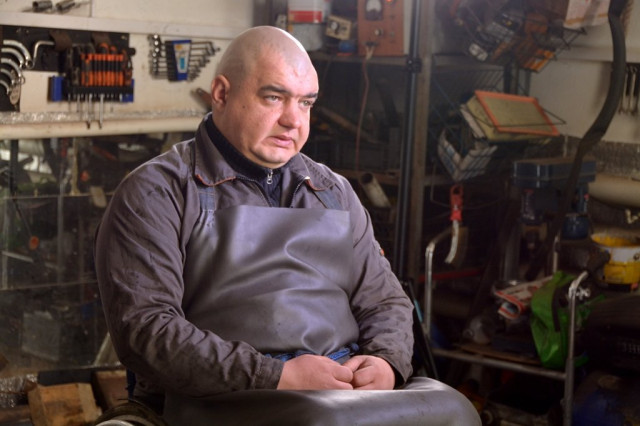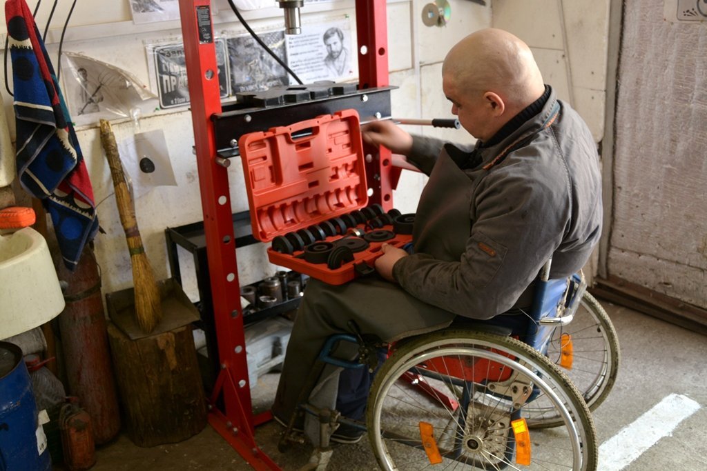 На технічне обслуговування в цю автомайстерню регулярно їздить Степан Підлознюк. Після серйозної травми хребта чоловік пересувається за допомогою милиць. Однак, це не заважає Степанові таксувати на переобладнаній іномарці.