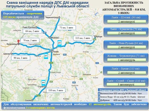 Відтак тепер безпеку на цих шосе забезпечуватимуть працівники патрульної поліції. Зокрема, вони цілодобово позмінно чергуватимуть у складі 12 автомобільних патрулів на проміжках трас, загальна відстань яких становить 518 кілометрів.
