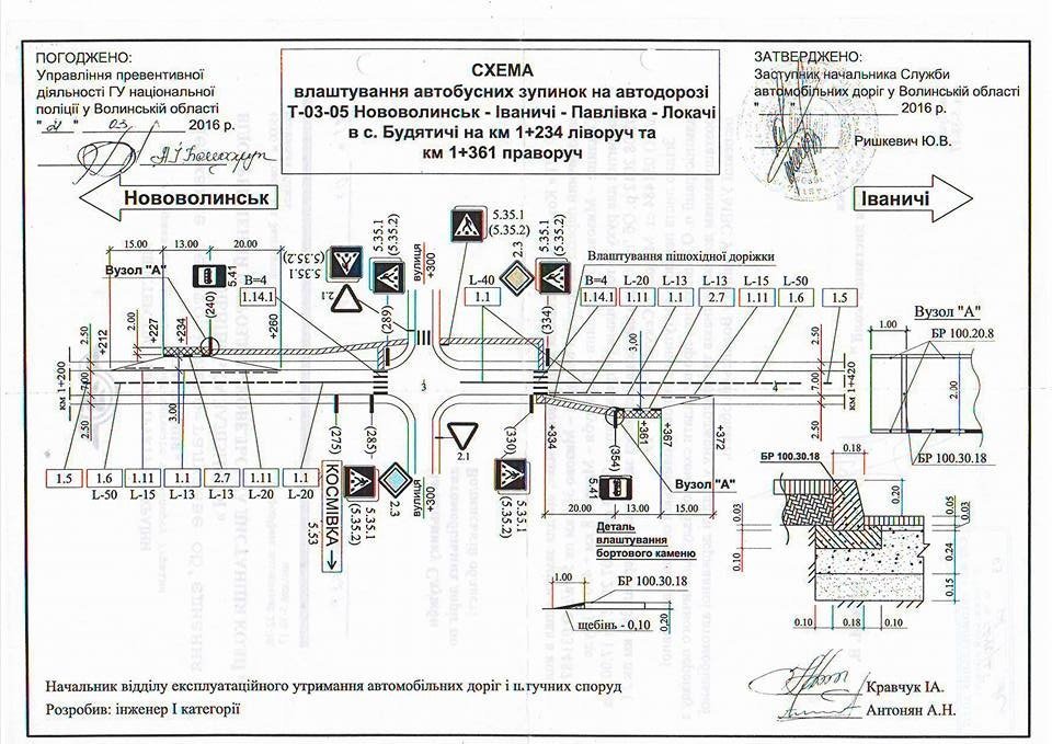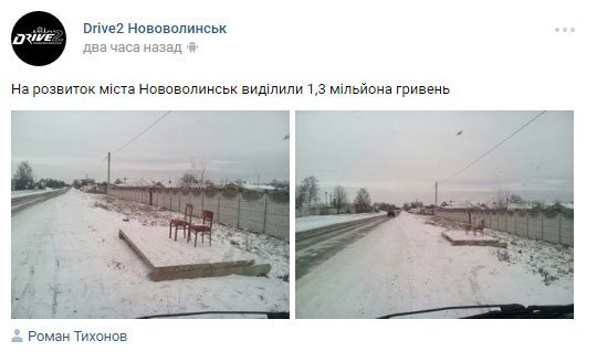 Користувач соціальної мережі Вконтакті #Роман Тихонов, 30 листопада, виклав фотографії плити і двох стільців на ній, які побачив на дорозі «Іванич - Нововолинськ», та підписав їх: «На розвиток міста Нововолинськ виділили 1,3 мільйона гривень», - повідомляє Нововолинський інформаційний портал.Пізніше вдалося з'ясувати, що це зробили активісти на чолі з #Назар Максимів, який повідомив у Фейсбуці, що займались автобусними зупинками у цьому районі. На їхнє встановлення та виготовлення зробили усі офіційні документи та дозволи, був навіть написаний проект під програму співфінансування, проте не підтриманий.Велась розмова з організаціями про встановлення брендової зупинки, у відповідність отримали, що хочуть її поставити кожен біля себе. Власних коштів на даний момент вистачило тільки на облаштуванням місця та купівлю двох знаків «пішохідний перехід».