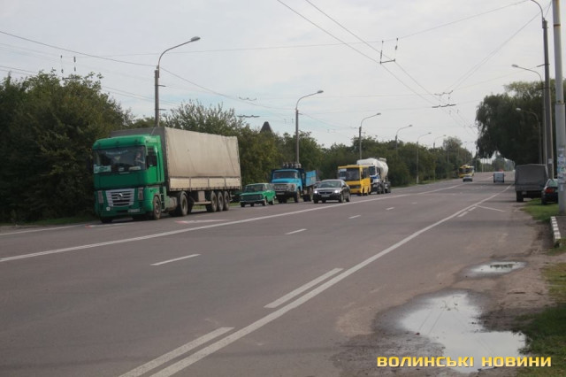 На трасі вишикувалась черга із десятка вантажівок і легкових авто з боку Луцька.