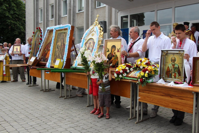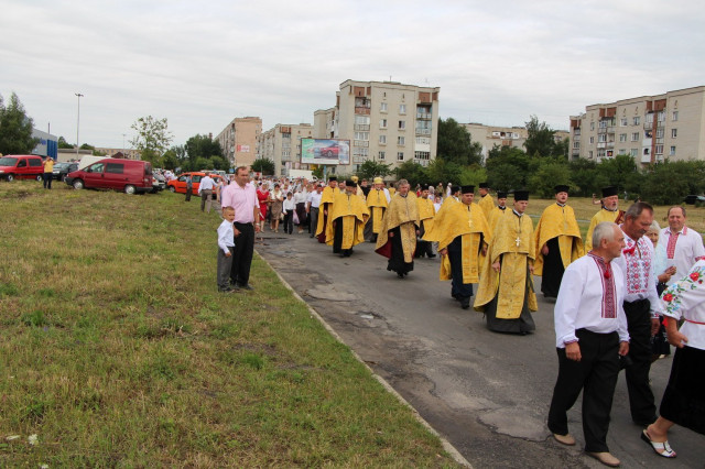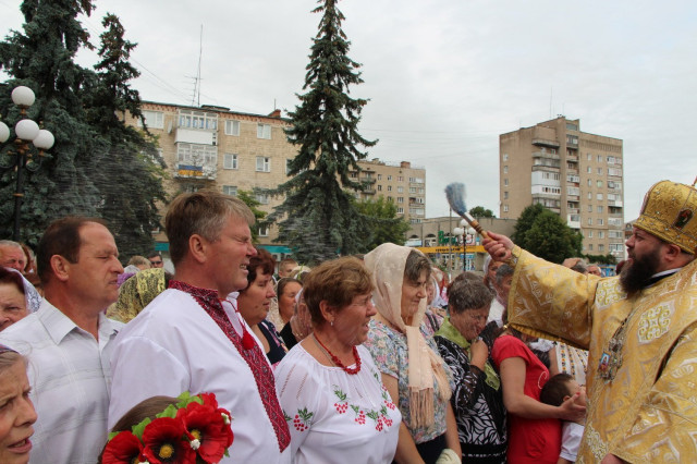 Після Служби Божої та освячення накупольних хрестів для храму, що будують поруч, відбулася хресна хода до центральної площі міста з іконами Богородиці Холмською та Тростянецькою, святого Володимира Великого та інших угодників. Дорогою до шестя приєднувались віряни з інших парафій райцентру.