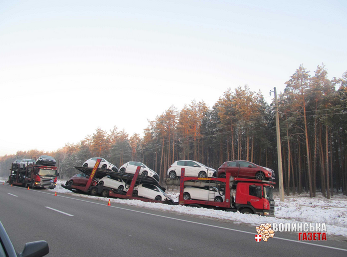 На трасі Київ – Варшава, за 5 кілометрів від стаціонарного поста ДАІ №2 смт Маневичі, вчора чи не кожен водій зупинився, аби подивитися, як тягач, навантажений новенькими «Тойотами», зійшов із траси та добряче похилися набік, - інформує «Волинська газета».
