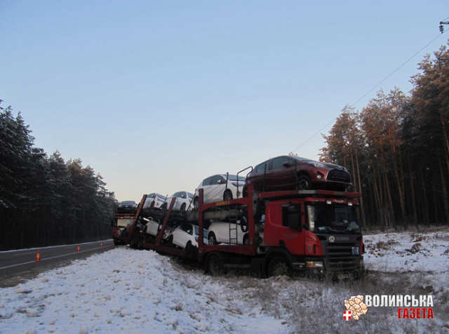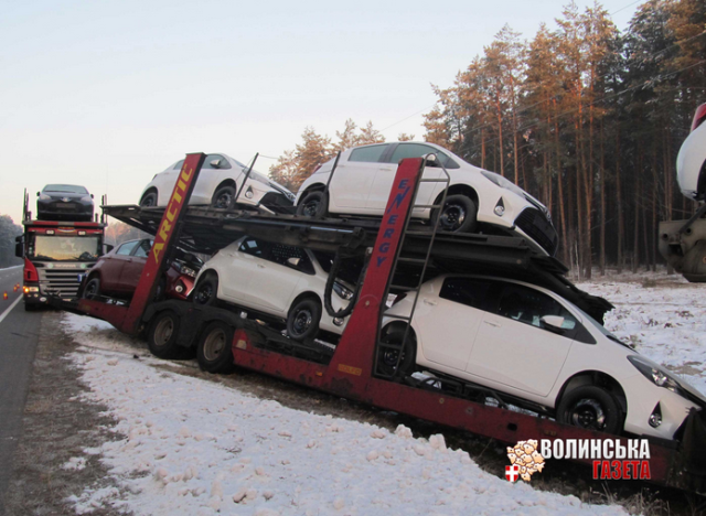 На Волині тягач, навантажений новенькими «Тойотами», злетів у кювет