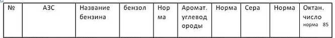 Таблиця № 1. Дослідження за стандартними показниками (вміст бензолу, сірки, ароматичних вуглеводнів, октанове число). Жирним виділені невідповідності зі стандартами.