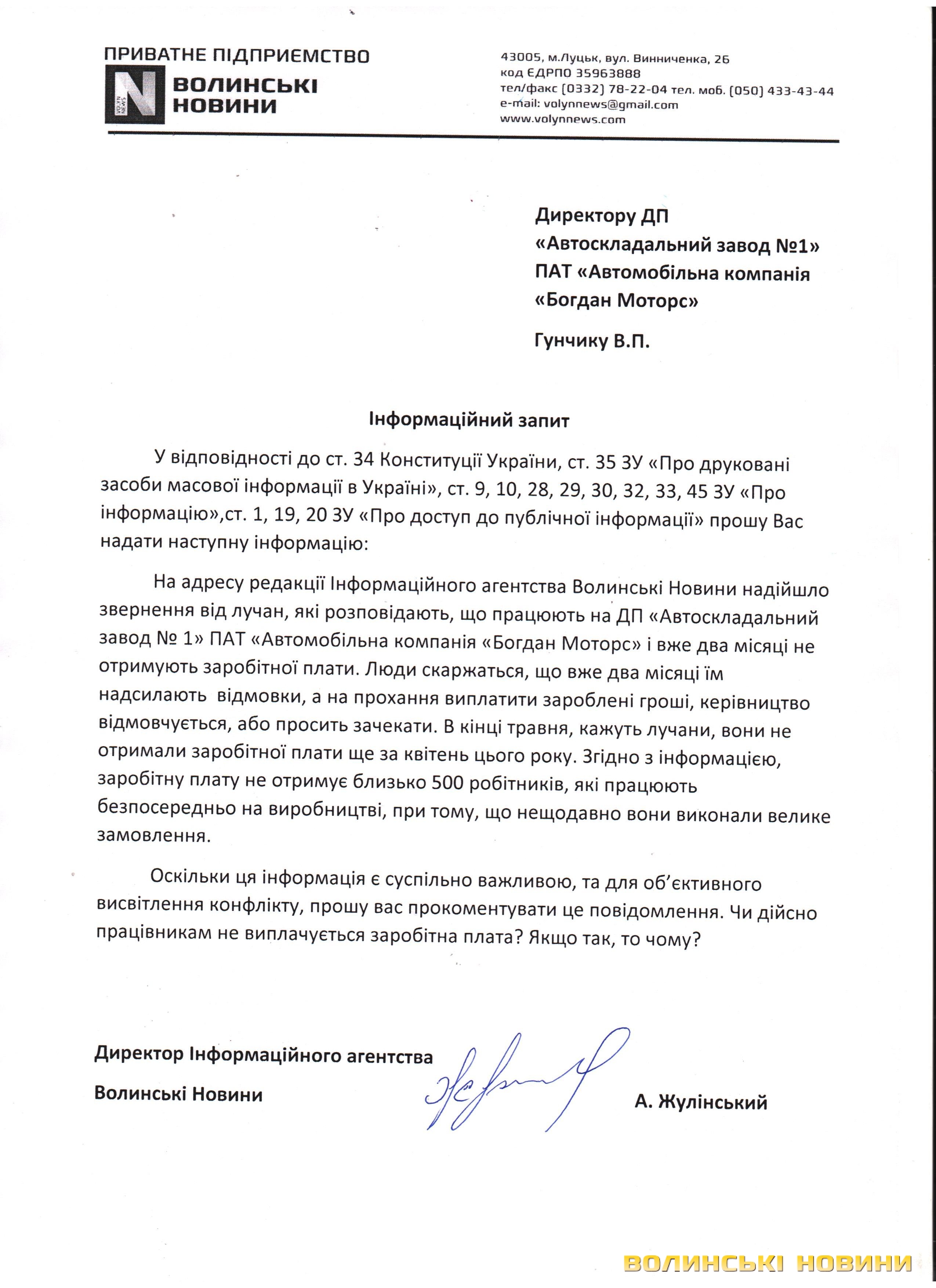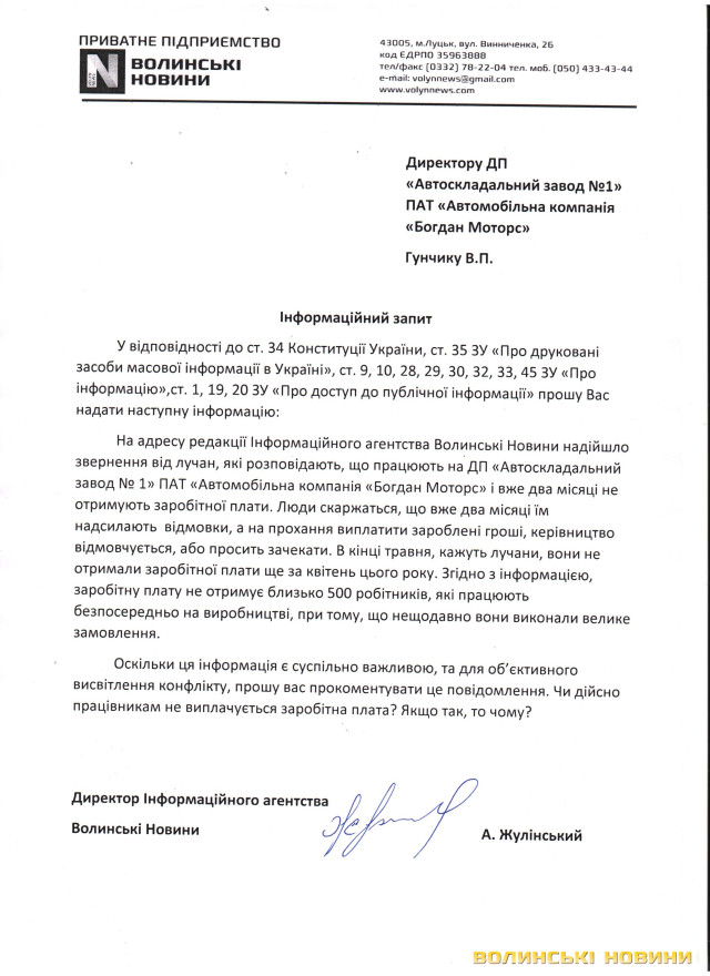 Оскільки в телефонному режимі отримати будь-яку інформацію з приводу невиплати заробітної плати працівникам не вдалося, то Інформаційне агентство Волинські Новини надіслало інформаційний запит на електронну адресу [email protected]. Видання сподівається, що керівництво прокоментує цю ситуацію і підтвердить або спростує інформацію про те, що близько 500 працівників великого волинського підприємства два місяці не отримують заробітної плати.