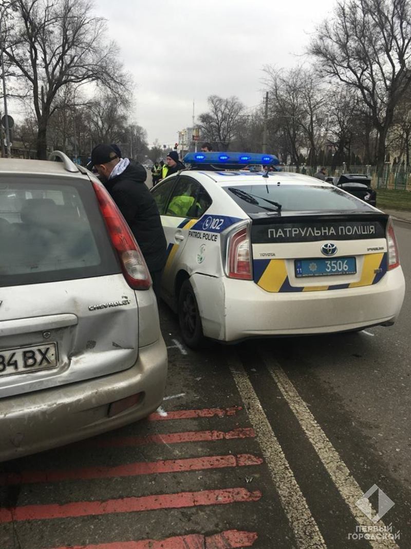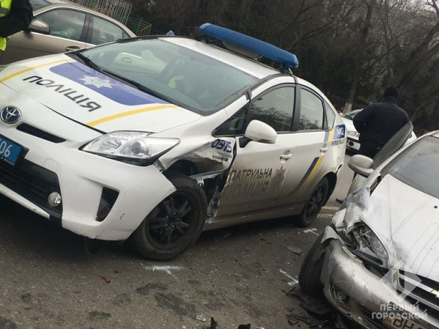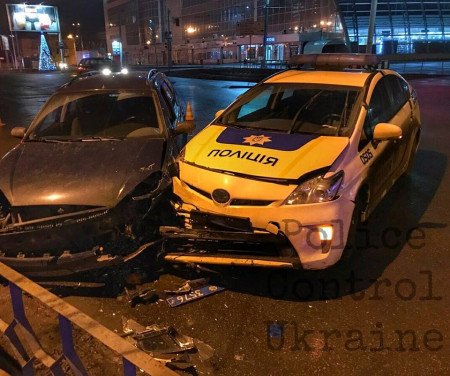 За словами свідків ДТП, поліцейські на Toyota Prius намагалися розвернутися через дві суцільні, в результаті відбулося зіткнення з автомобілем Chevrolet. У обох машин пошкоджений кузов. Постраждалих немає.