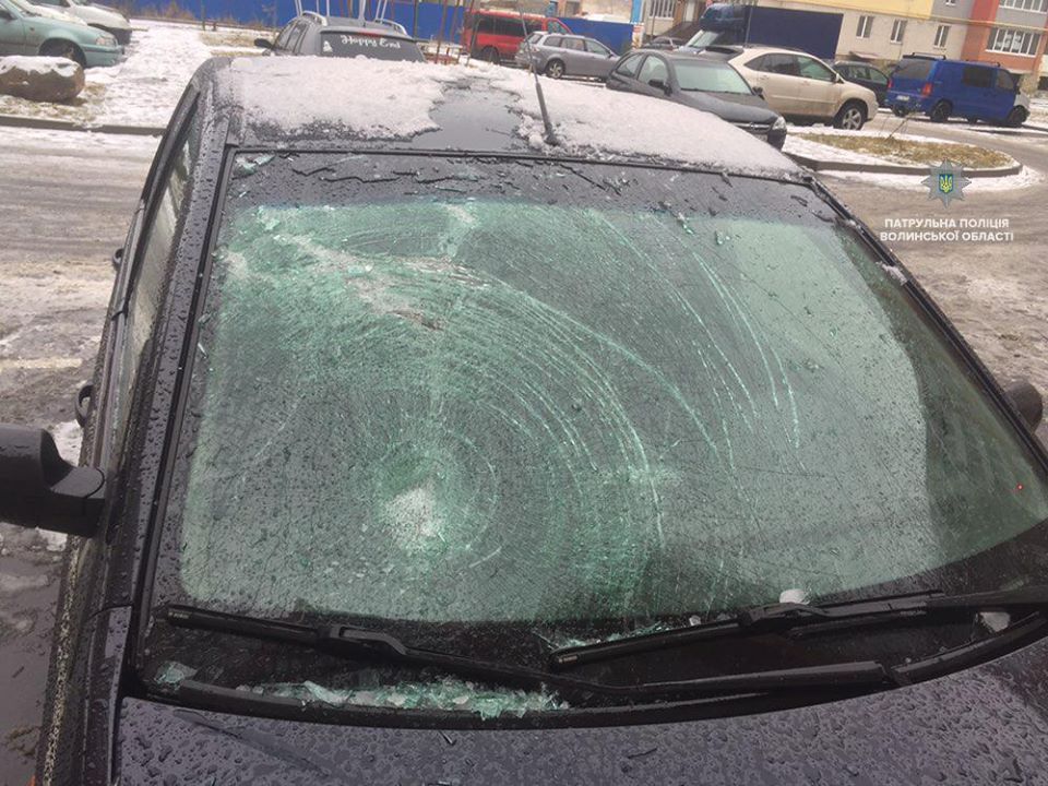 Крижана брила, яка впала з даху будинку на вулиці Арцеулова в Луцьку, пошкодила припарковане авто.