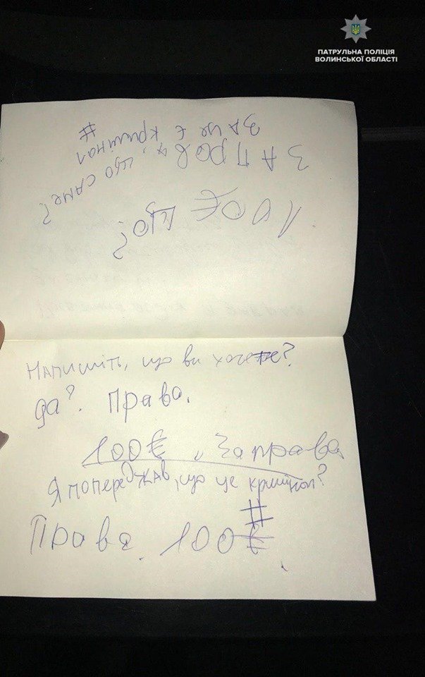 «Перебуваючи всередині службового автомобіля, знову попросив блокнот, записав туди суму у 200 євро, потім вийшов, узяв гроші та кинув між сидіння ще дві купюри. Попередження про кримінальну відповідальність і неодноразові написи про це його не зупинили», - додає інспекторка патрульної поліції Аліна.