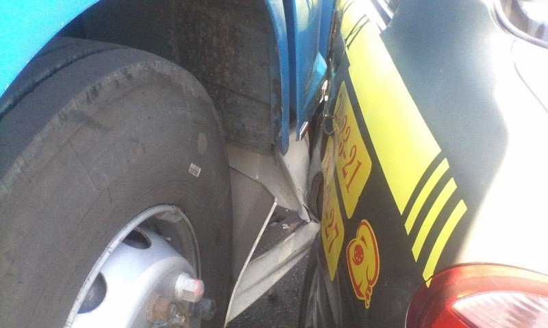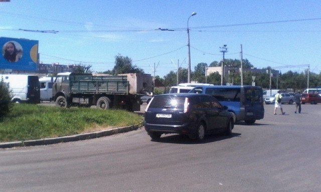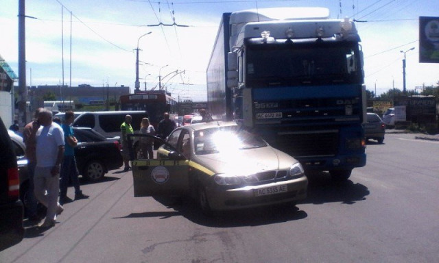 У районі Варшавського ринку біля ТЦ ЮВАНТ аварія: зіткнулись фура (TIR) та легковик Daewoo (навчальний).