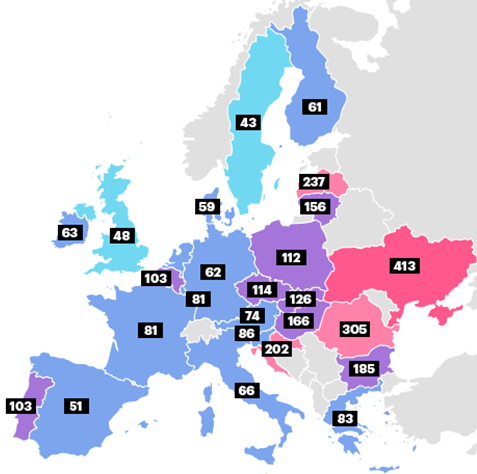 Згідно з даними, кількість смертей на 1 мільйон транспорних забосів за рік в Україні становить 413 осіб.