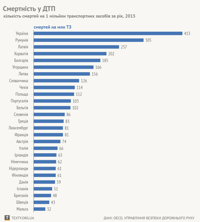 У 2015 році Україна займала перше місце по кількості загиблих від ДТП в розрахунку на 1 млн транспортних засобів.