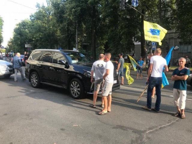 На вулиці Шовковичній стався інцидент, позашляховик начебто наїхав на одного з учасників акції, які блокували проїзд. Зараз машину оточили спецпризначенні, які не дають учасникам акції дістатись до пасажира і водія. Хто ці люди, поки не відомо.