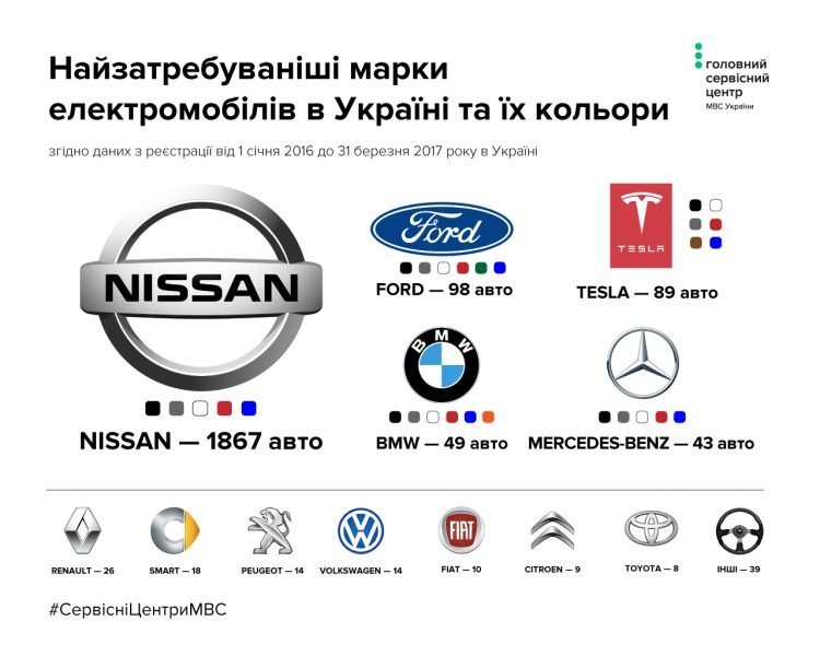 Що стосується марок електрокарів, то найбільш затребуваними є авто марок Nissan, Ford, Tesla, Mercedes, BMW.