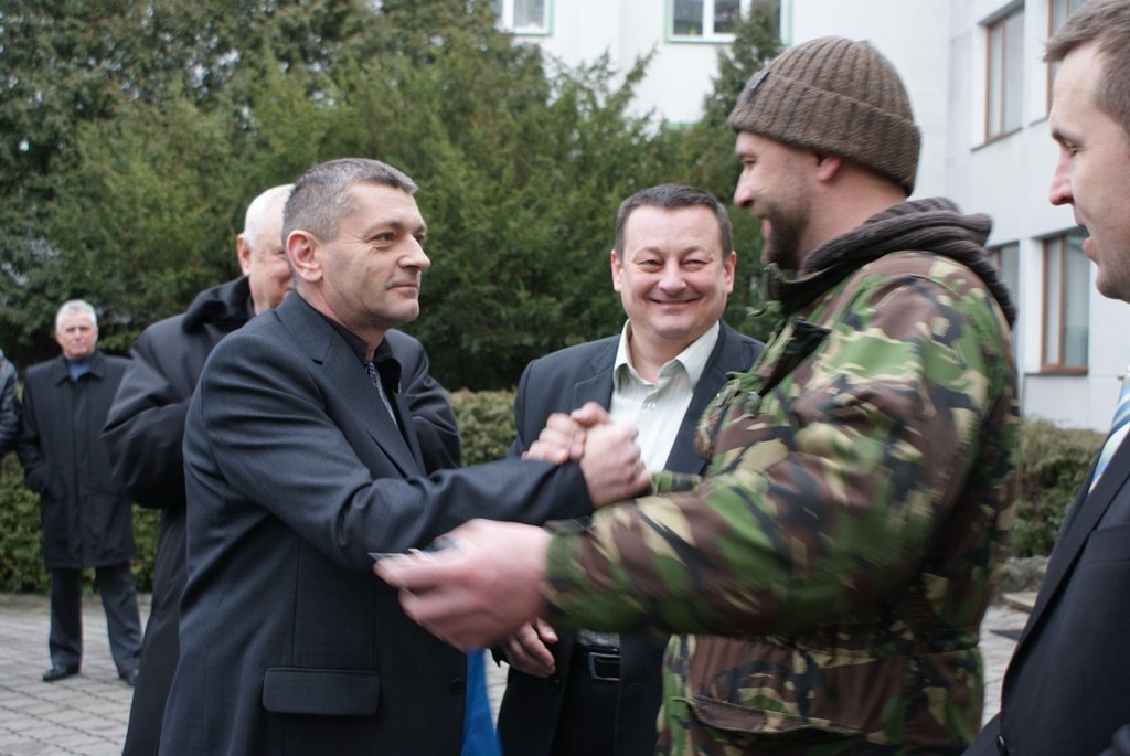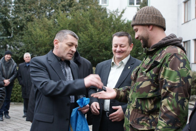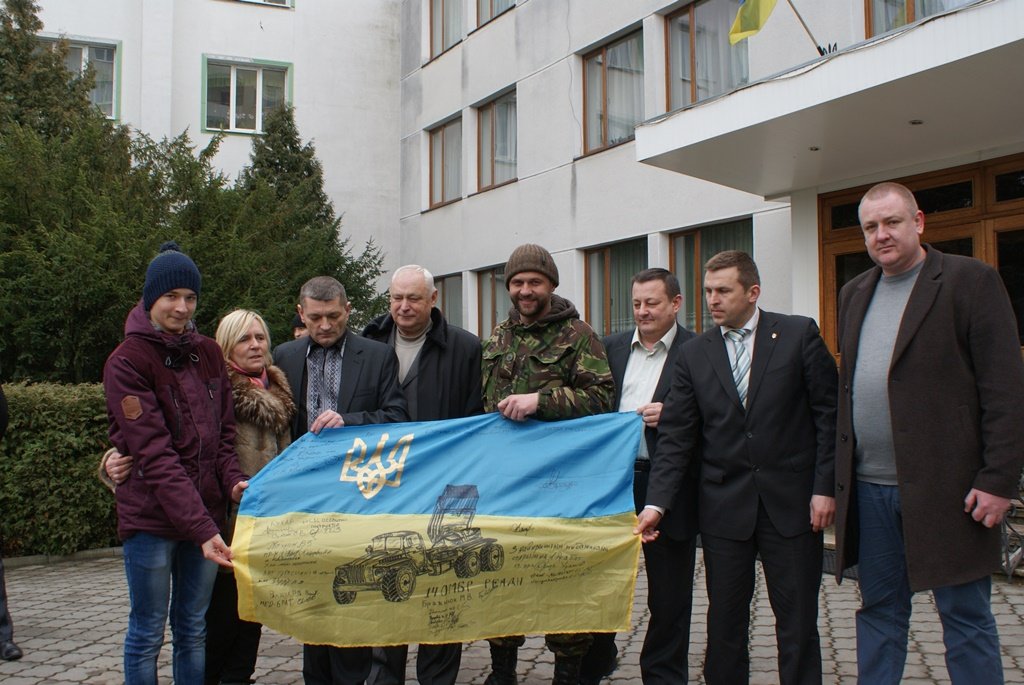 Своєю чергою, боєць Олександр Кравченко передав головному ліснику області Василю Мазурику бойовий синьо-жовтий стяг із підписами бійців, які перебувають у зоні АТО.З його слів, такий автомобіль є значною допомогою для військових, адже ним можна мобільно пересуватися по бездоріжжю, здійснювати розвідку, перевозити поранених побратимів.