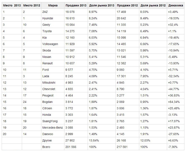 ЗАЗ випередив Hyundai і став лідером українського авторинку-2013. РЕЙТИНГ