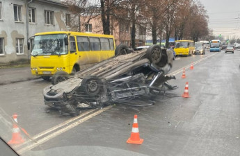 Біля магазину «АТБ» на Львівській в результаті аварії перекинувся легковий автомобіль «Мазда 6». На цій ділянці дороги утворився затор, рух ускладнений.