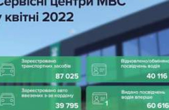 Сервісні центри МВС у квітні зареєстрували 87 025 транспортних засобів (нових та вживаних, перші та повторні реєстрації разом)