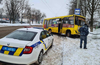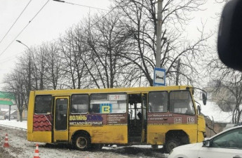 У Луцьку маршрутку під час об'їзду тролейбуса занесло на зустрічну смугу, де вона зіткнулася з припаркованим легковиком. Потім вона в'їхала у дерево