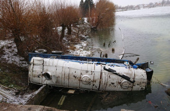 Молоковоз, який з’їхав з дороги і впав у водойму в селі Лище Луцького району дістають з водойми з допомогою двох кранів. Молоко з цистерни почало витікати у воду, через аварію та обрив труби три села залишились без газопостачання.