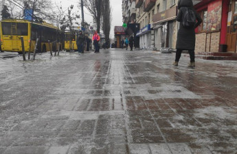 Комунальні служби з ранку активно працюють та посипають автошляхи і тротуари. На зупинках громадського транспорту це роблять двірники.