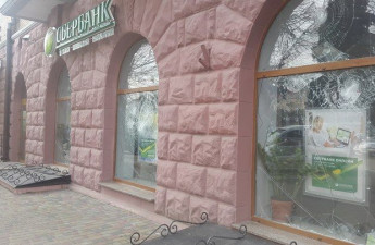 Банківські установи, яким невідомі особи пошкодили вітрини, відновлюють роботу у штатному режимі, проте ситуацію із пошкодженням майна не коментують