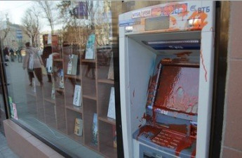 У центрі Луцька невідомий облив червоною фарбою банкомати двох банків