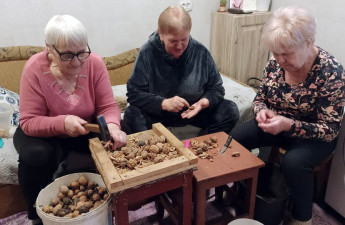Жінки з села Веснянка збираються щодня від початку повномасштабного вторгнення. Мішки та сітки з горіхами їм приносять безплатно люди, також присилають горіхи поштою з Донецької, Сумської, Чернігівської, Хмельницької та Львівської областей.
