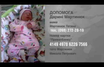 У півторамісячної дівчинки Даринки Мартинюк із села Чорниж лікарі виявили страшну патологію, яка трапляється на півмільйона новонароджених. Маленьких діток з таким діагнозом не лікують в Україні, а на операцію у Білорусі потрібно зібрати $10 000. Проте, у родини немає таких коштів, тож усіх небайдужих просять допомогти коштами на лікування дитини.
