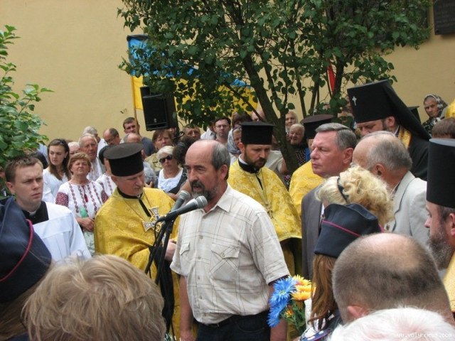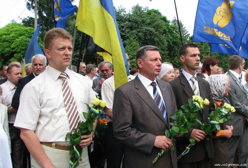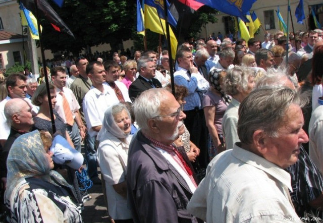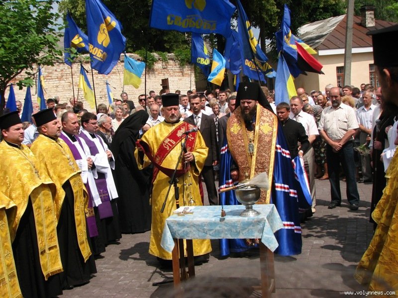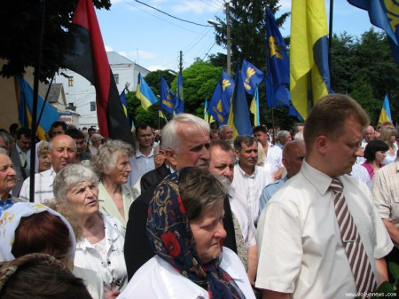Не обійшлося на панахиді і без політичних гасел та стягів. Окрім синьо-жовтих державних прапорів, перев’язаних чорною стрічкою, на подію принесли чимало політичних стягів ВО «Свобода».