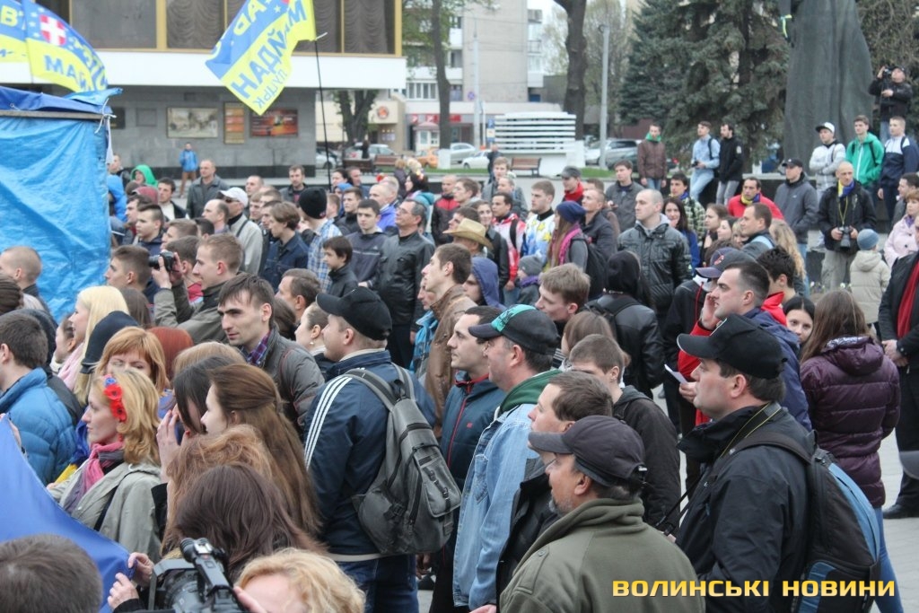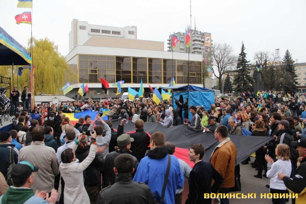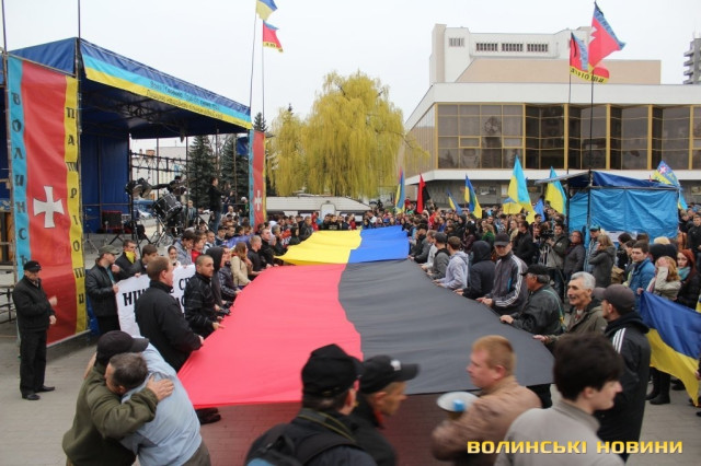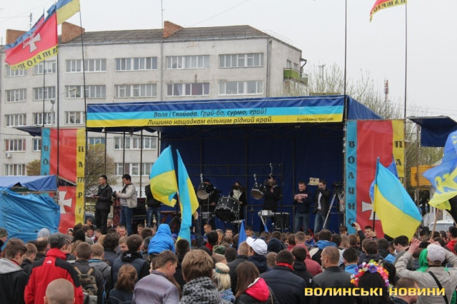Зі сцени луцького Євромайдану учасників акції закликав виконати гімн України керівник силового блоку Правого сектора Волині Сергій Мерчук. Після цього виконали пісню гурту «Ляпис Трубецкой» «Воины света».