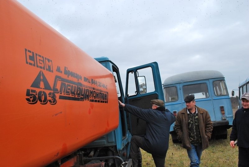 Тим часом трапилося «НП» - у вологому грунті застряв водовоз. Хлопці, зливайте воду.