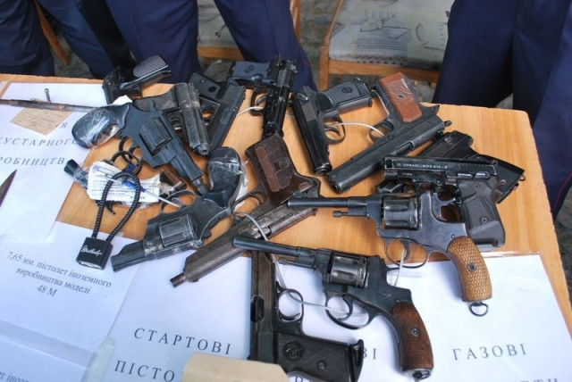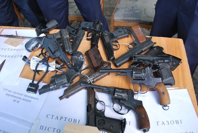 Правоохоронці демонстрували підроблену продукцію, фальшиві паспорти, вилучену зброю. Зокрема, серед зразків були два вилучені револьвери, 1939 та 1944 років.