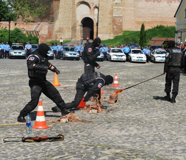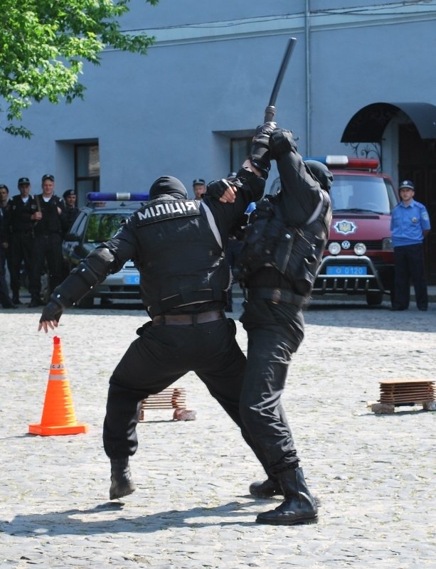Правоохоронці спецпідрозділу «Сокіл» демонстрували прийоми рукопашної бою та самозахисту. Міліціонери показували, як захищатися від нападу зловмисника, у руках якого може бути зброя.