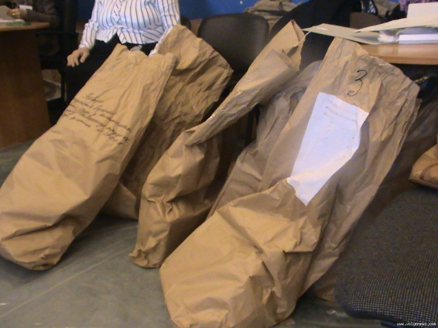 На сходах до будівлі міськради - великі черги. По три члени кожної ДВК зранку привезли пораховані бюлетені.
